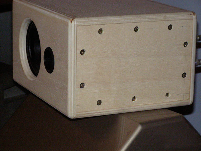 To je bila ta kutija, u nju sam složio notch filter (LRC paralelni filter) za poravnavanje frek. karakteristike, dodao dosta vune (umjetne) za dampiranje i nisam bio zadovoljan, pa sam izbacio dio vune i to je bilo bolje, pa sam onda izbacio i filter što se u prvi mah činilo bolje, ali nakon nekog vremena sam ga vratio nazad, jednostavno mi se činilo da je nekako mirniji u svirci. Nisam stavljao zobel za glancanje impedance jer jednostavno nisam razmišljao u tom smjeru.