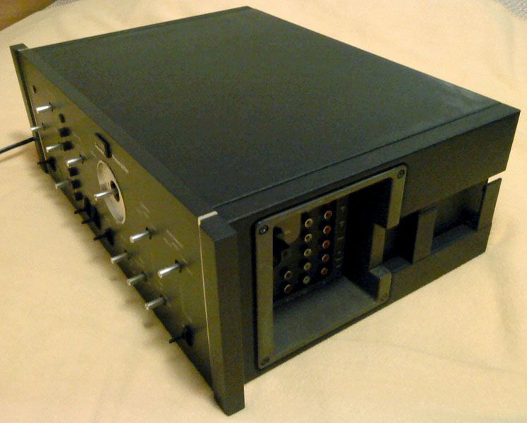 S donje strane s puno bolje vidi cijela ergela plocica. S lijeva na desno: pojacalo za slusalice (skriva se prema lijevom donjem kutu slike), midrange ton kontrola (poseban sklop!), bass+treble ton kontrola, ploca s filterima (opet izvedeni aktivno, preklopnik na ploci line stage-a selektira je li uopce na putu signala), i na kraju kombinacija 3 ploce (jedna vodoravna i 2 okomite) koje su zalemljene skupa i cine preklopnik ulaza, tape monitoringa i snimanja: